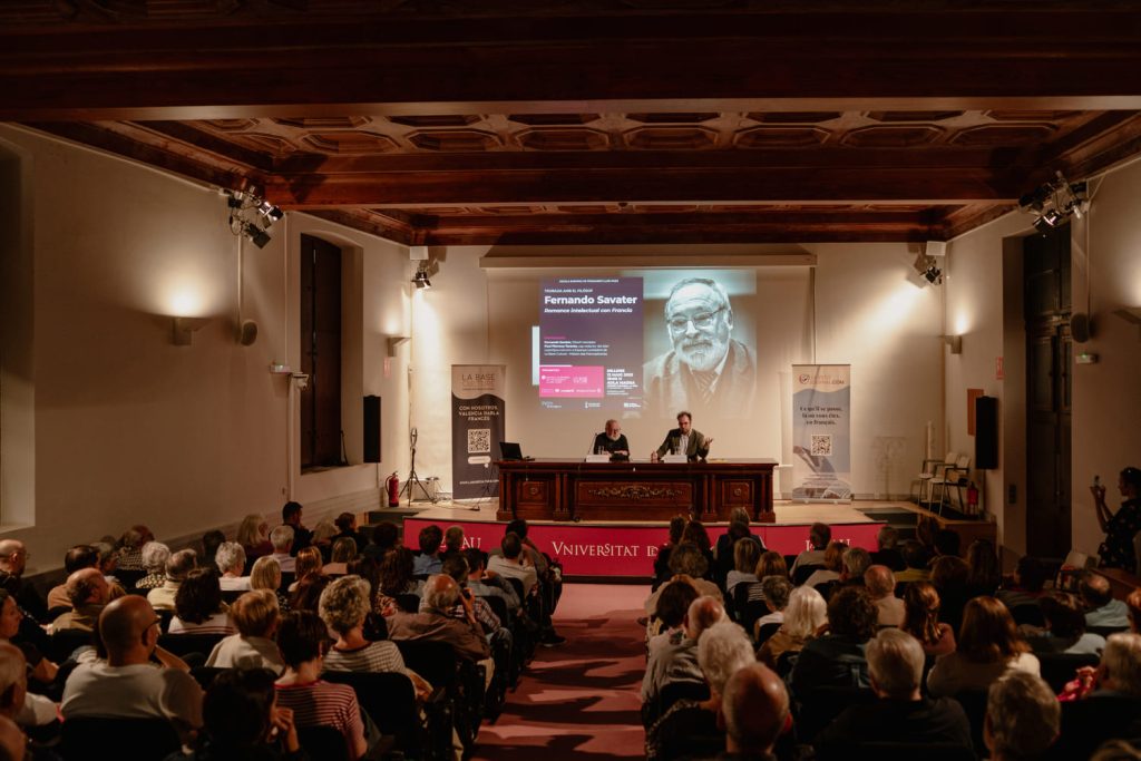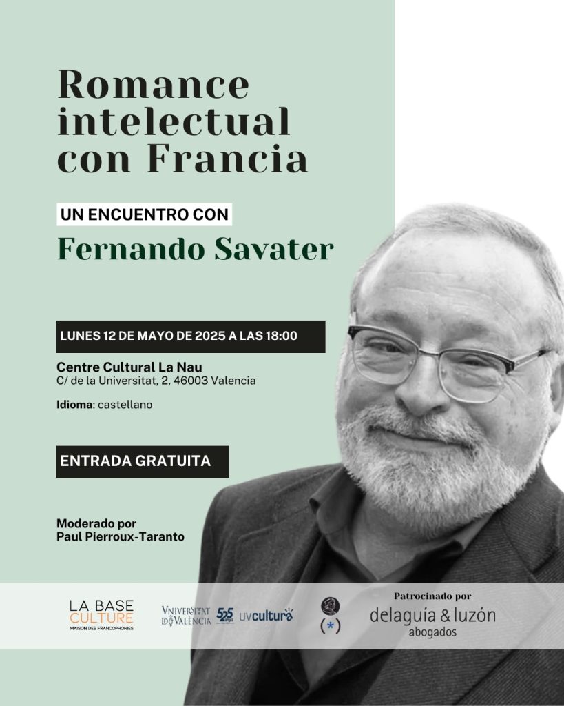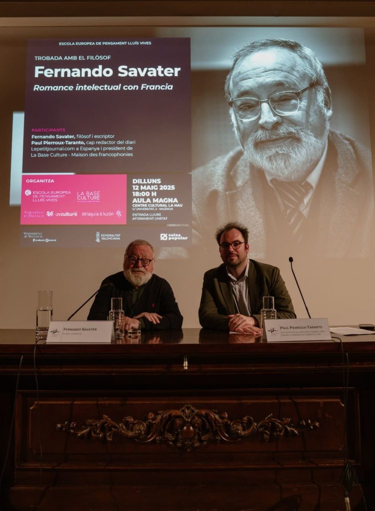 Le 12 mai 2025, le Centre Cultural La Nau de l’Université de Valencia a accueilli une figure majeure de la pensée espagnole contemporaine : Fernando Savater. Philosophe, écrivain, traducteur et pédagogue, il est venu partager avec le public son “Romance intelectual con Francia”, une déclaration d’amour passionnée à la culture et à la pensée françaises.